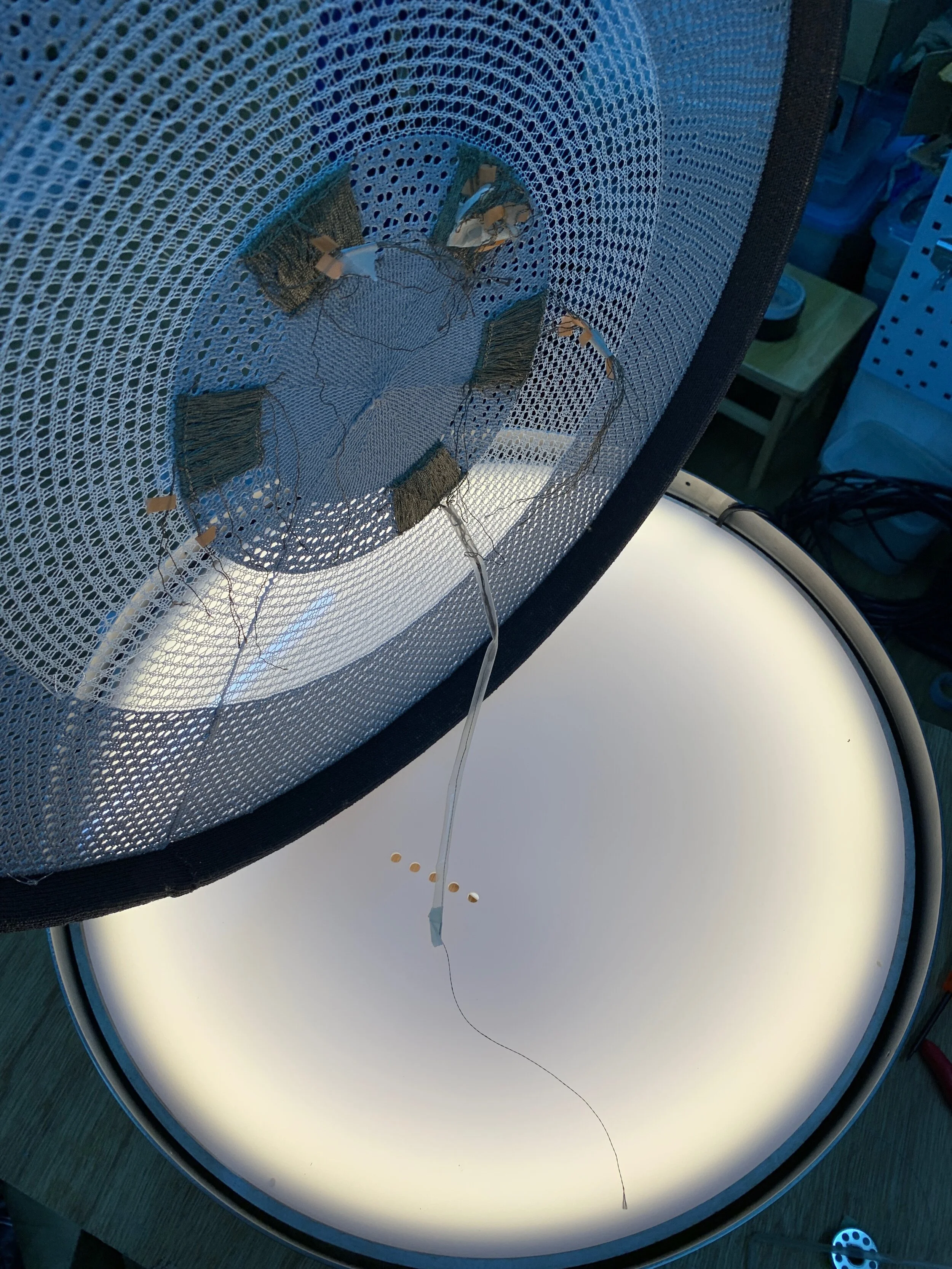 Stage 4 - In collaboration with a local Technologist, we connected the conductive embroidery to a series of LED lights that are programmed for specific light patterns based on touching the knit surface